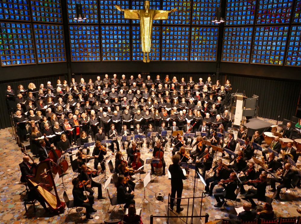 Am 3. Mai, dem Tag des Konzerts, erschien eine inzwischen munter zusammengewachsene Chorgemeinschaft zur Generalprobe. Das Konzertprogramm stand. Der Psalm 42 von Felix Mendelssohn Bartholdy, „Wie der Hirsch schreit“ und das „Gloria“ von Francis Poulenc. Dazu drei Kompositionen für den Frieden: die „Cantate de la paix“ von Darius Milhaud, „Dona Nobis pacem“ von Wojciech Kilar und zum Abschluss noch einmal Mendelssohn, mit „Verleih uns Frieden“. Die Gedächtniskirche war ausverkauft.